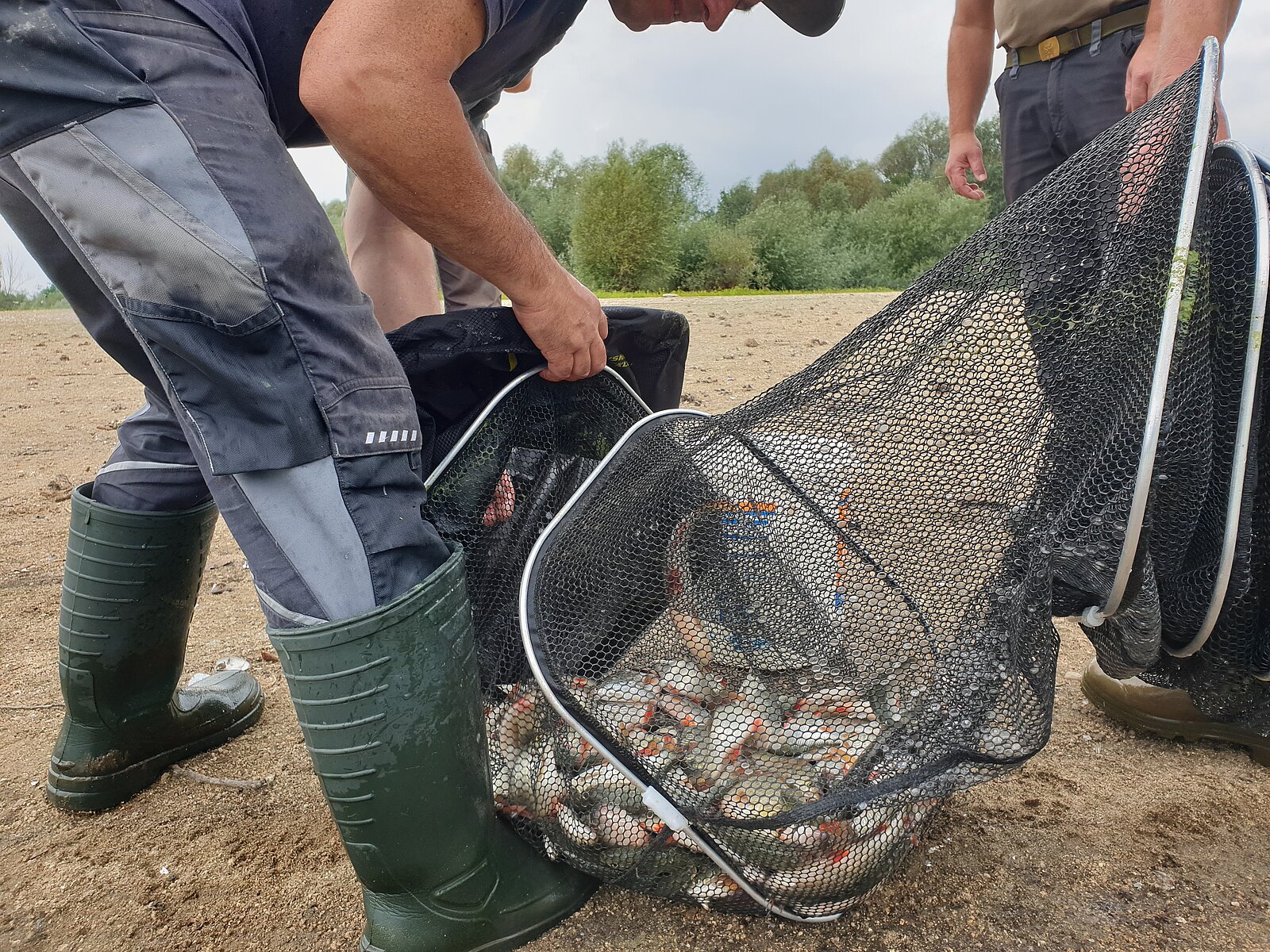 Der niedrige Wasserstand der Talsperre war für das Hegeangeln günstig. Dadurch waren mehr als genug Angelstellen vorhanden. Die allermeisten Teilnehmer angelten im Bereich des Badestrandes bzw. links und rechts davon. So viele Angler nebeneinander, ein unglaublich beeindruckendes Bild. Bei fast 30° C und Sonne pur war das Beißverhalten der Fische leider nicht ganz so wie erhofft. Der recht frische Wind erschwerte zudem die Bisserkennung. Der guten Laune tat das aber überhaupt keinen Abbruch. Es fand ein reger Austausch zu Angelmethoden, zur Köderwahl, zu Möglichkeiten der Zubereitung, … statt. Für das leibliche Wohl wurde ebenfalls gesorgt. Am Pavillon des AVE, unmittelbar an der verbandseigenen Slipstelle, wurde ab Mittag jedem Teilnehmer ein warmer Imbiss gereicht. Das war auch der zentrale Platz, um mit Vertretern des Verbandes ins Gespräch zu kommen und an dem auch die gefangenen Fische abgegeben werden konnten. 110 kg Weißfische wurden noch am Nachmittag dem Zoo in Dresden übergeben. So haben wir ganz nebenbei auch noch eine weitere gute Tat vollbracht. Erfreulicherweise hat auch so mancher Petrijünger seine gefangenen Fische, besonders die großen, für die eigene Verwertung mitgenommen. Insgesamt kann von einer Weißfischentnahme von etwa 150 kg ausgegangen werden. Das Ergebnis kann sich unter diesen Bedingungen auf jeden Fall sehen lassen.
